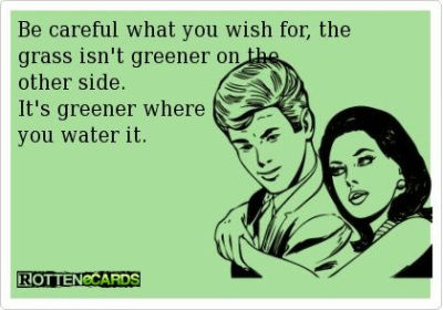 The grass is (always) greener on the other side is used for saying that life seems better somewhere else, or other people’s situation seem better than ours.