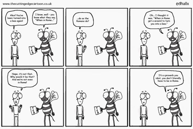 When in Rome (do as the Romans do) is used for saying that when you are in a foreign country you should follow the local customs and ways of behaving. But this proverb doesn’t only refer to a foreign country but also someone’s home, community etc. You need to follow the rules of behavior that govern the environment you are in.