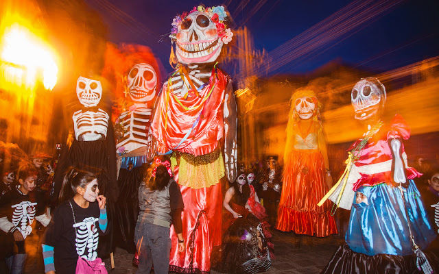 The Day of the Dead celebrations (in Mexico) might seem to be very similar to Halloween. In both celebrations people dress up in costumes, there are a lot of skeletons everywhere, and there are special sweet treats and candies given out. Also people spend a lot of time in graveyards and death imagery is everywhere.